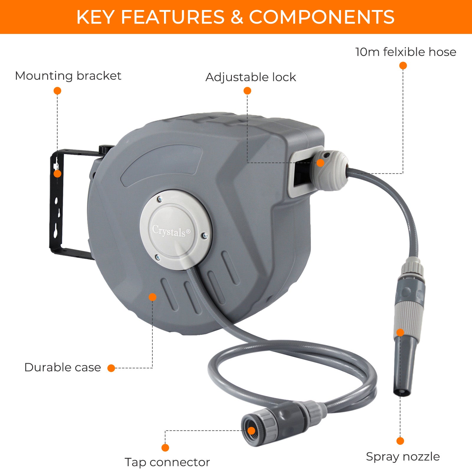 Transform your gardening experience with the Crystals 10 Meters Compact Garden Hose Reel. This innovative garden tool is designed to make maintaining your garden effortless and convenient. It's compact design and wall-mountable feature allow for easy storage and space-saving, making it perfect for small to medium-sized gardens.