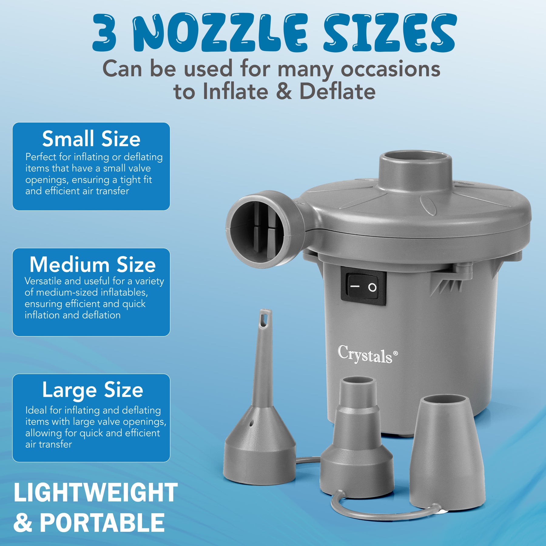 Make inflating and deflating effortless with this high-performance 240V Electric Air Pump. Compact, lightweight, and designed for efficiency, this pump is ideal for quickly inflating airbeds, paddling pools, inflatable toys, and more. With a sleek grey finish and ergonomic design, it fits comfortably in your hand for easy use. Comes complete with three nozzle attachments to suit a variety of valve sizes – perfect for camping trips, garden use, or home convenience. Simply plug it into any UK mains socket and let the pump do the hard work for you!
