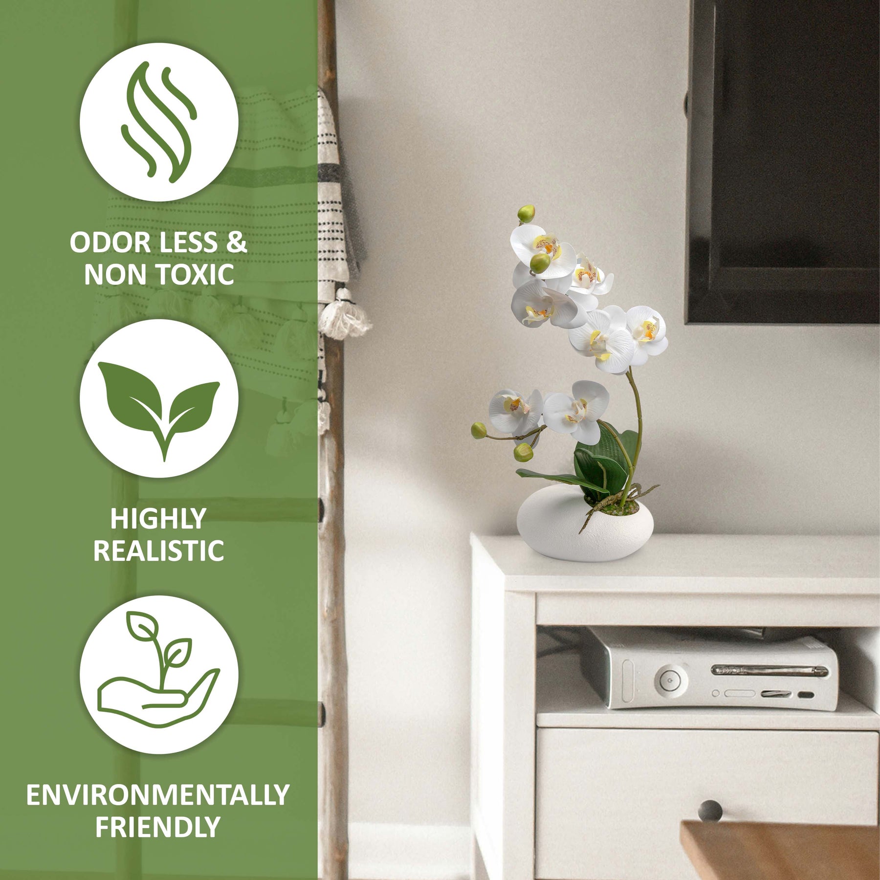 Add a touch of natural elegance to your space with this beautifully crafted artificial Phalaenopsis orchid. Featuring lifelike blooms and realistic foliage, this faux flower arrangement offers the beauty of real orchids without the maintenance.