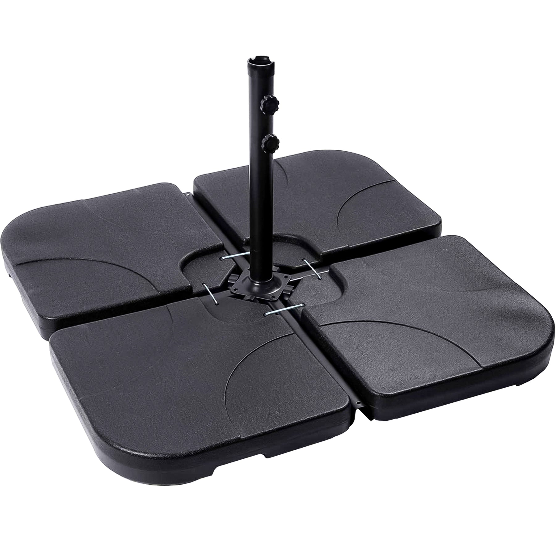 These portable 4Pc attractive designs made with High-density polyethene plastic material sand water-filled cantilever umbrella parasol base stand weights are ideal for protecting parasols from blowing over in strong winds. Ensure your parasol is always held firmly in place with sand-water-filled stand weights. These two types of shape parasol base stand weights are comprised of four pieces/components which fit together easily with sand water-filled. Portable parasol base stand weights are features with engraved ergonomic carry handles for easy transportation. It can be multi-use in a home, coffee shop, restaurant or pub etc. Two types of parasol base stand weights are available to choose from Square shaped & Fan-shaped.