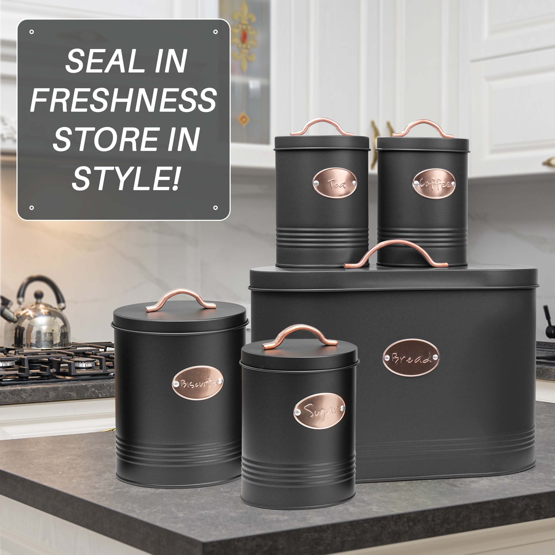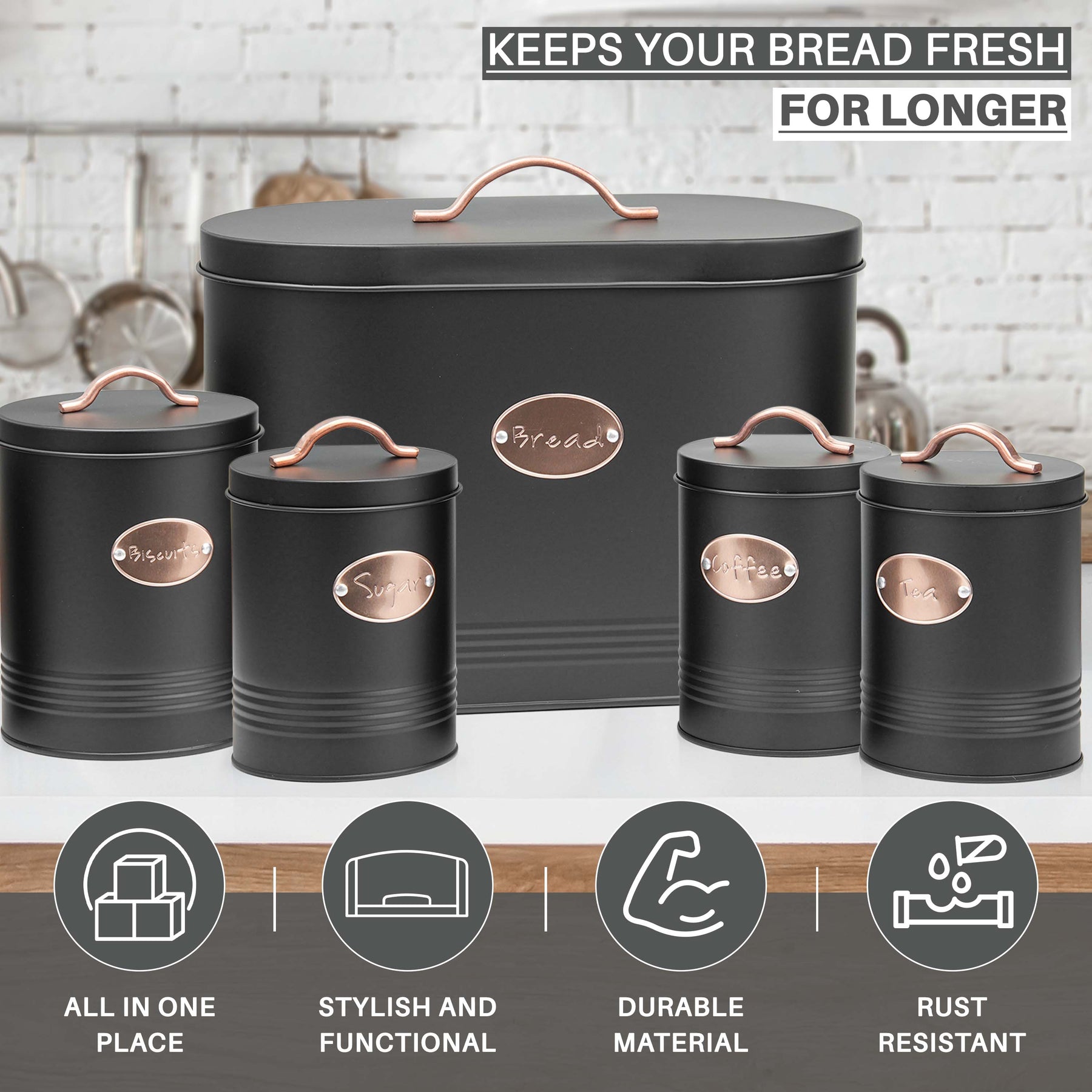 • 5pc Bread Bin set with copper features, Perfect for all kitchen decors
