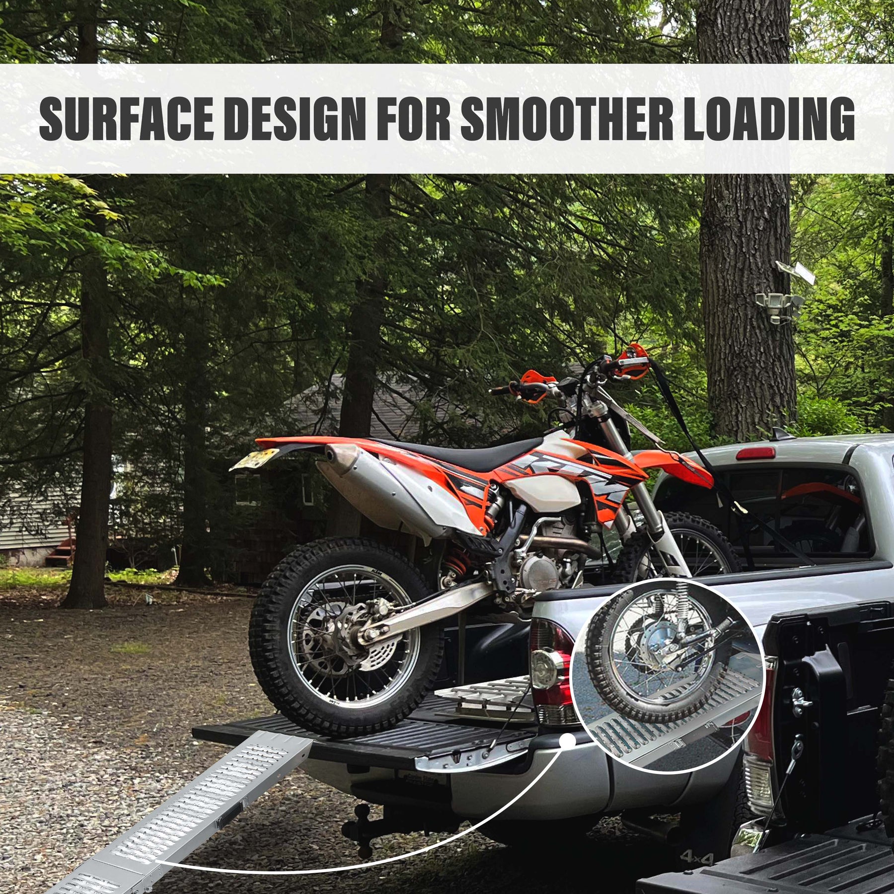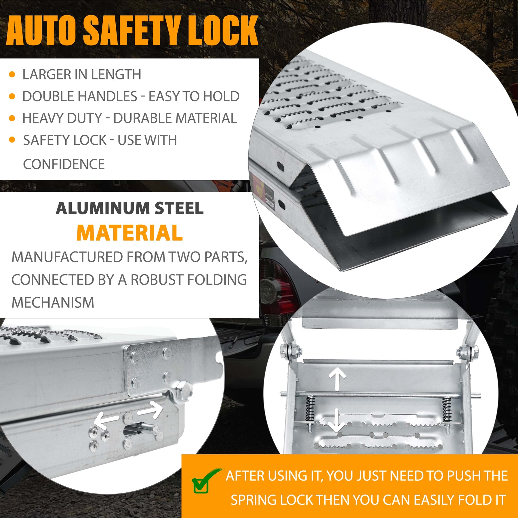 This heavy-duty folding loading ramp is designed for safe and efficient loading of motorcycles, lawn mowers, tractors, and other motorized equipment. Made from galvanized Q195 steel, it is corrosion-resistant and built to withstand up to 200kg of static weight per ramp. With anti-slip ridges and stabilizing plates, the ramp provides maximum safety during use. When folded, it becomes compact enough to fit in tight spaces, making it a convenient and space-saving solution for home garages or professional workshops.