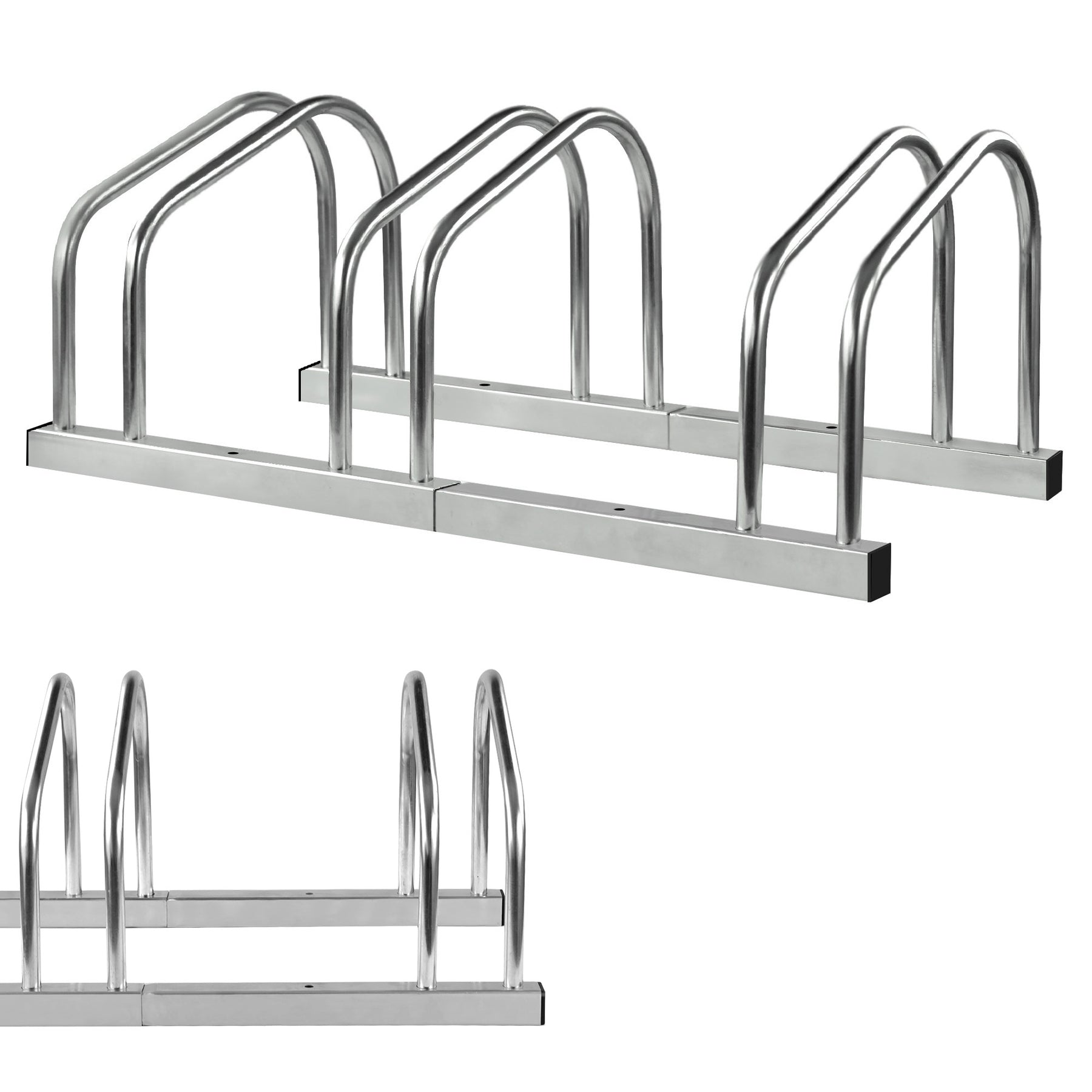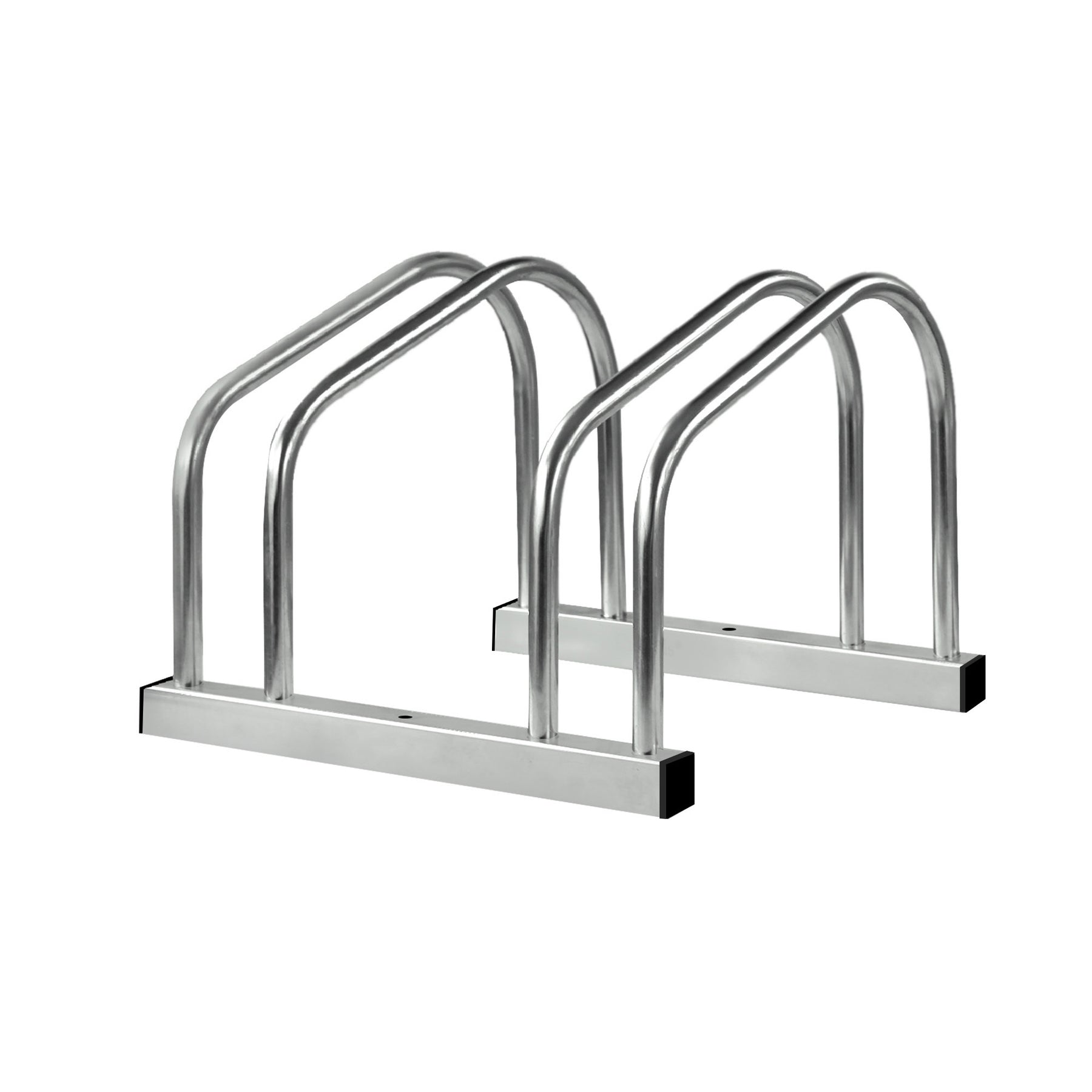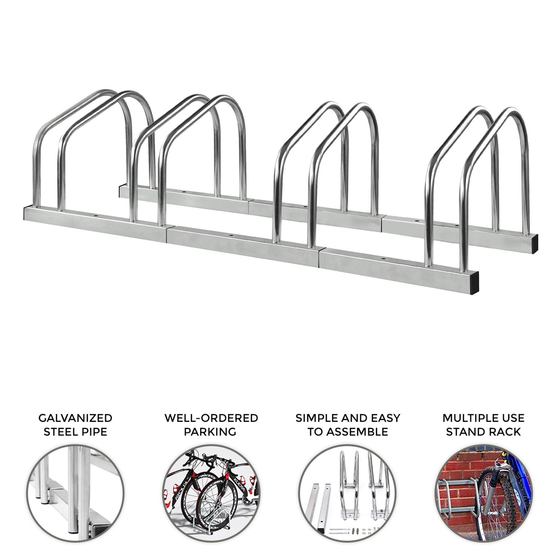 Heavy duty durable galvanized steel pipe constructed bicycle parking rack floor stand storage rack stands are ideal for storing bikes securely in sheds, garages and garden to protect bikes form scratches or damages, as well as making the parking well-ordered. The bicycle stands are pre-drilled mounting holes on the rack, completing with fixings. It has features with premium galvanized steel pipe surface ensure the stand rack will not get rusty over the time and durable to use for long term use. The bike stand racks are available in four sizes to park 2, 3, 4 or 5 bikes.