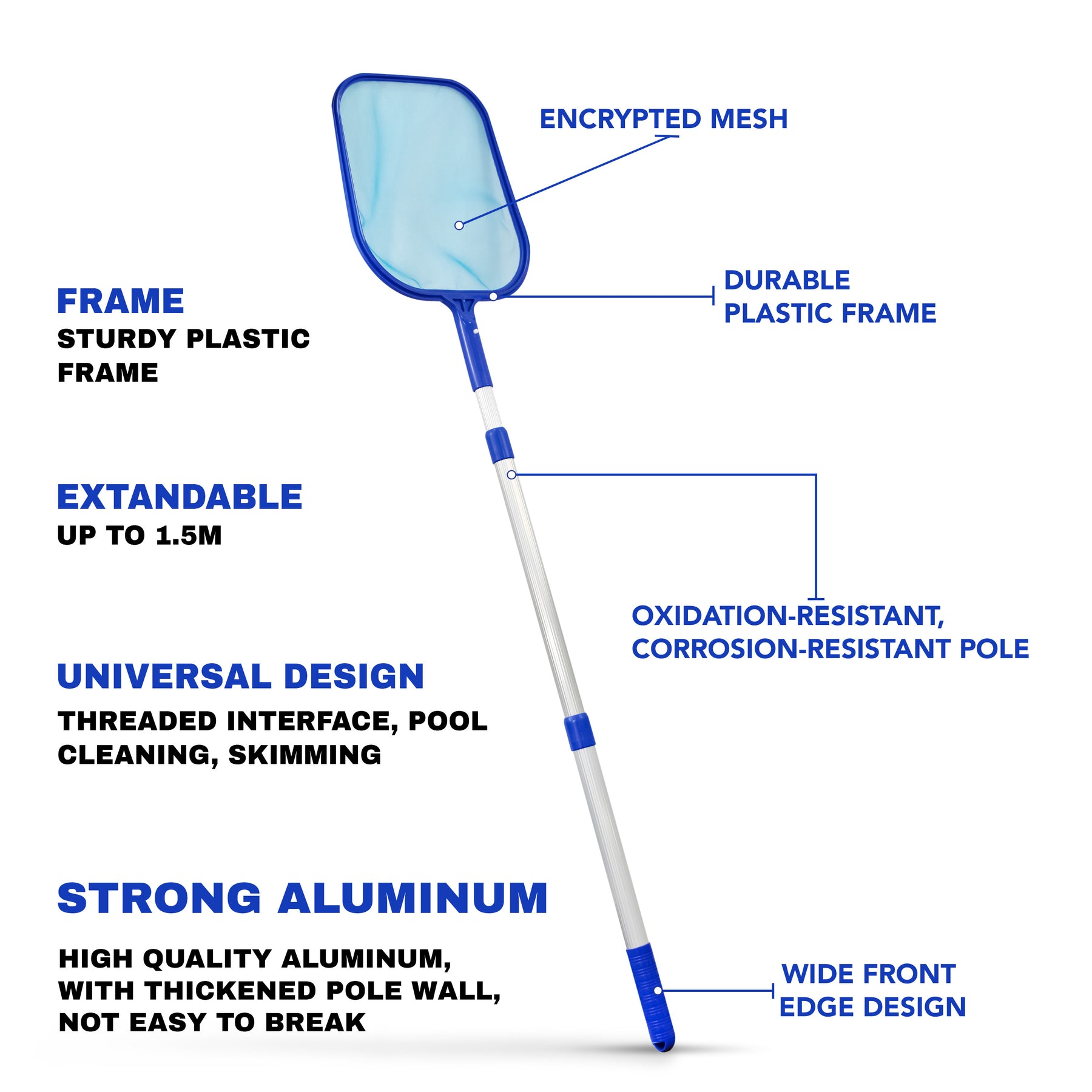 Swimming pool leaf debris skimmer telescopic pool is perfect to clear leaves and debris from your pool surface. Looking to skim leaves and floating debris from you outdoor pool? The Clean Cast Skimmer Set is perfect pool cleaning accessory to help you keep your pool clean and clear from all the flotsam and jetsam which is a natural part of the maintenance of an outdoor swimming pool. The long lightweight aluminium pole extends to a pool leaf skimming net, which gently lifts and sifts bits of dirt and debris out of the water, making your above ground pool nicer to swim in, and saving your filter some extra work. The long pole and net pool cleaner stops you from getting wet, helps you reach to the middle of the swimming pool, and to clean leaves from the bottom of the pool too.