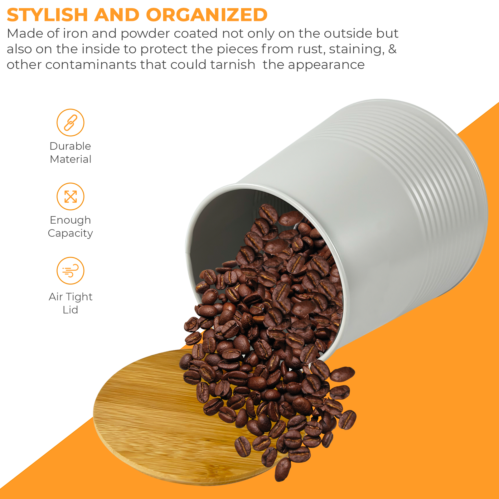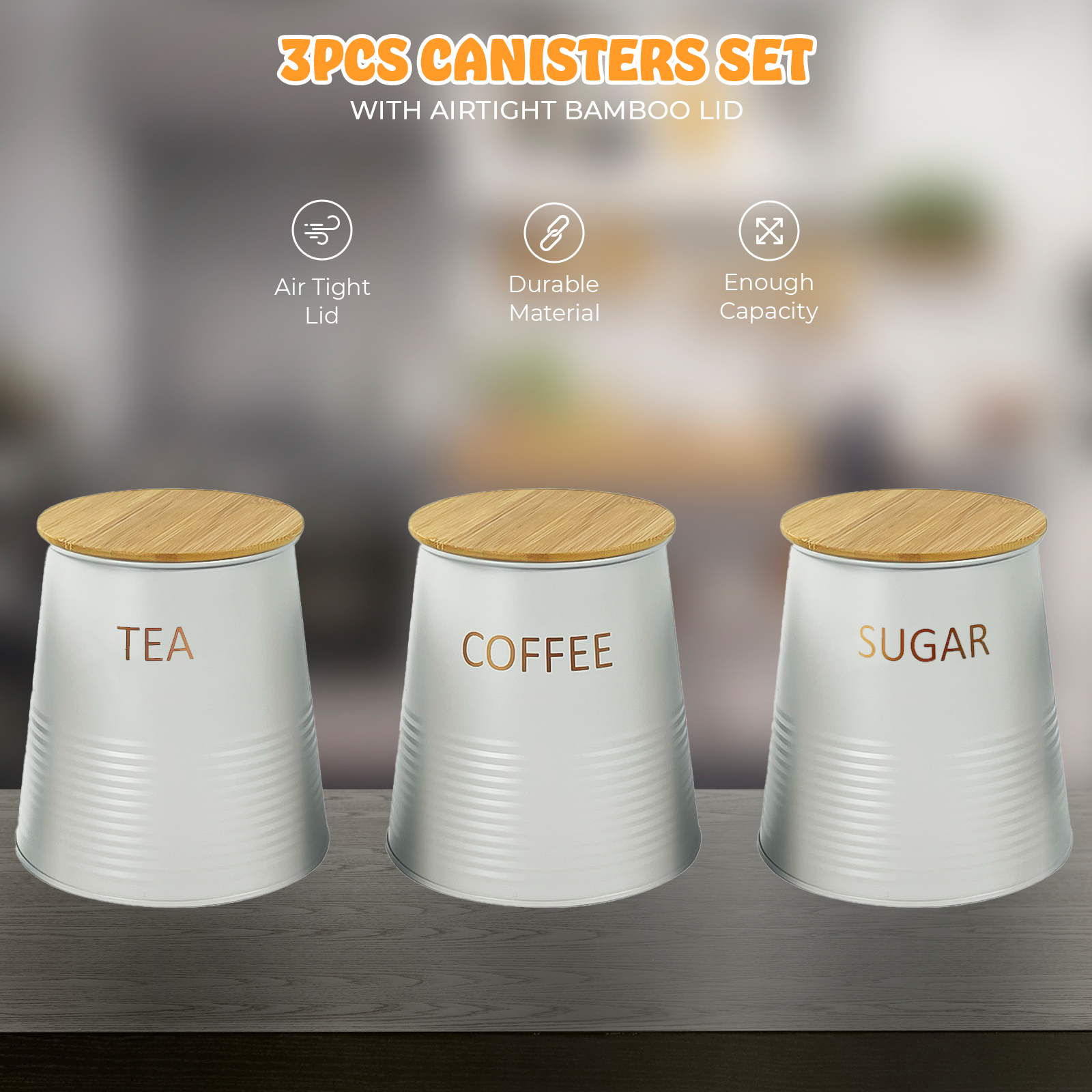 These set of 3, Tea Coffee Sugar canister with wooden lid complement all decors! Easy open and store you daily essentials. Hight quality canister is has an embossed plate and keeps your essential fresh. Helps to keep your kitchen countertops tidy and well organized.