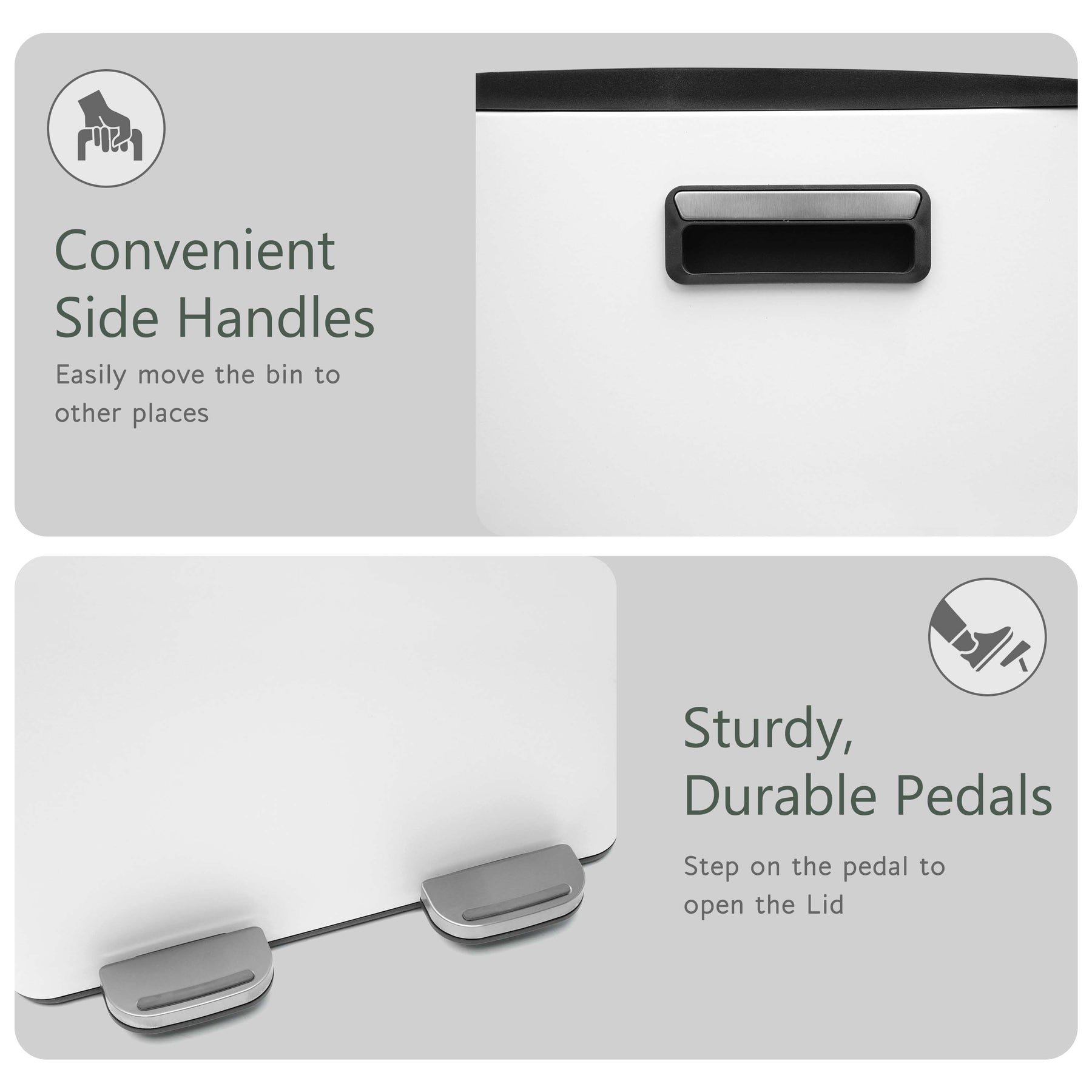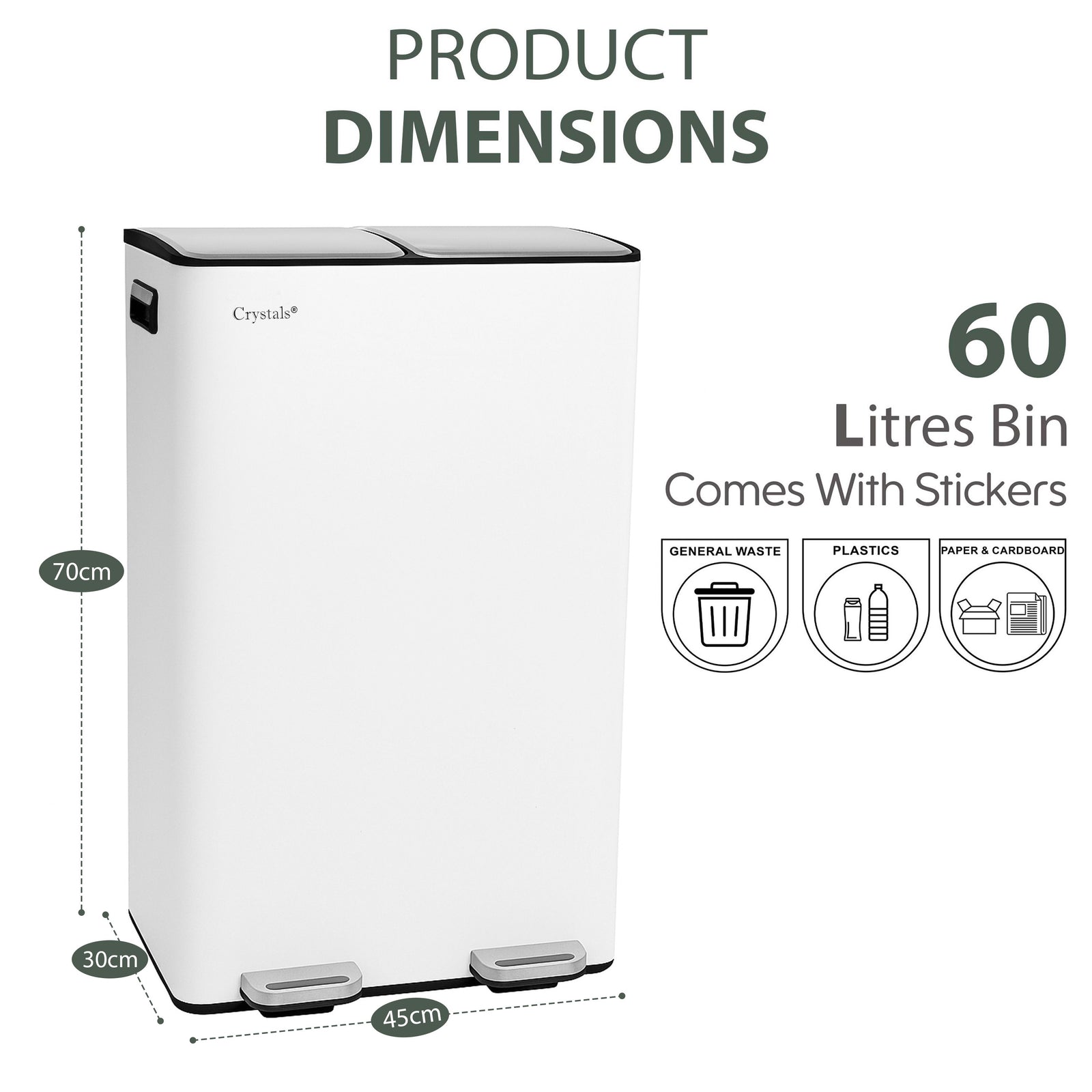 Each side of the bin holds 30L, allowing convenient separation of general waste and recyclables. The soft-close lids prevent slamming and help contain odours, while the removable inner buckets with handles make cleaning and emptying effortless. Bonus waste stickers are also included to help you label and organise.